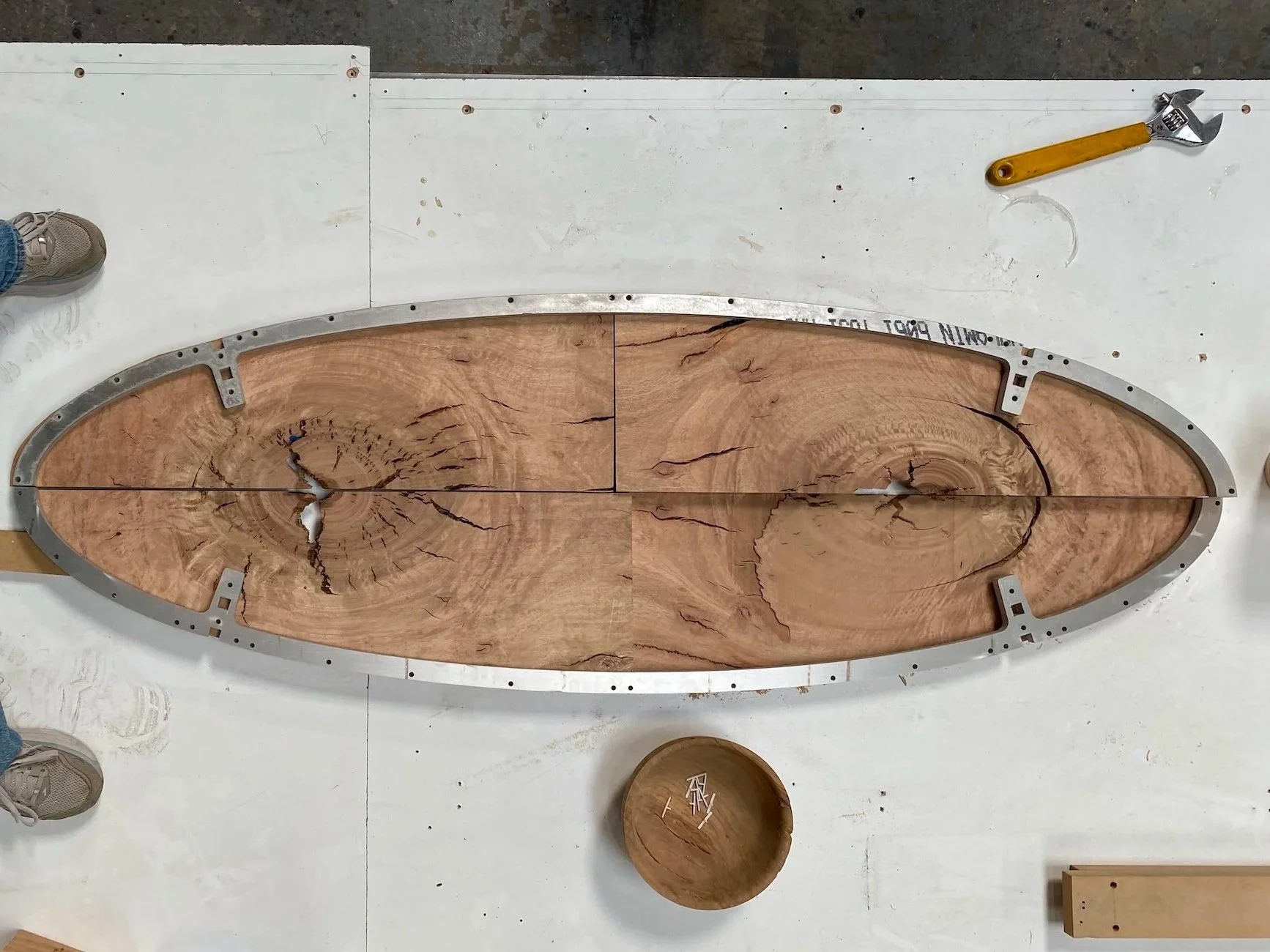 In Progress: Elliptical coffee table made with butterflied off-cuts from Eucalyptus slab